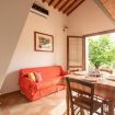 Un luminoso soggiorno-pranzo con cucina a vista, tavolo allungabile (4-6 posti), comodo divano letto e TV. Un piccolo disimpegno conduce al bagno, elegante e funzionale, e alla prima camera matrimoniale, arredata in autentico stile rustico toscano con un romantico letto a baldacchino.